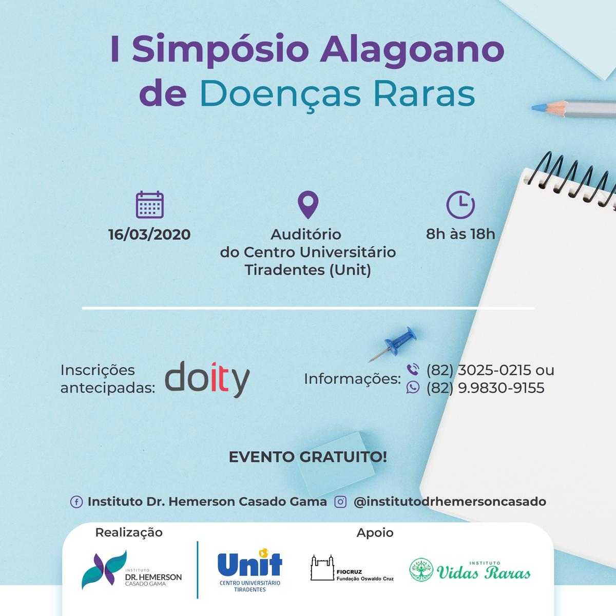 Em homenagem ao Dia Mundial de Combate e Conscientização das Doenças Raras, comemorado no último dia 29 de fevereiro, o Instituto Doutor Hemerson Casado promove o I Simpósio Alagoano de Doenças Raras, a ser realizado no dia 16 de março de 2020, das 8h às 18h, no auditório do Centro Universitário Tiradentes (Unit), em Maceió.