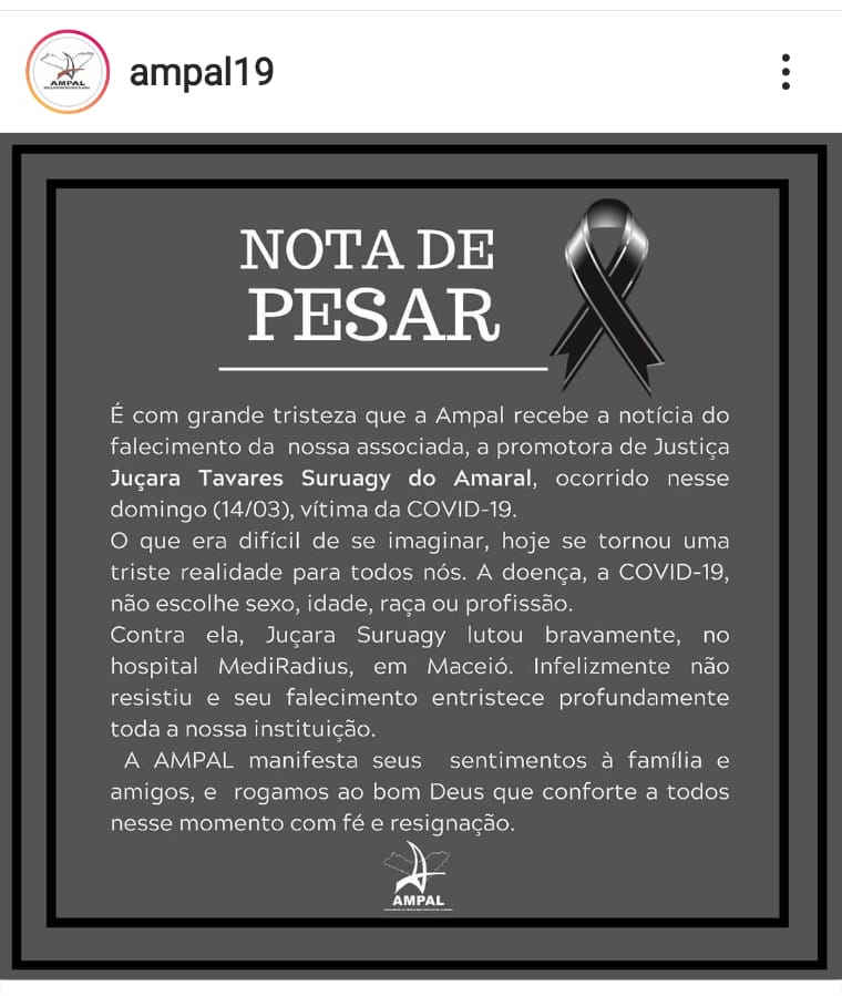"A doença, a covid-19, não escolhe sexo, idade, raça ou profissão", alertou em nota a Associação do Ministério Público de Alagoas (Ampal).