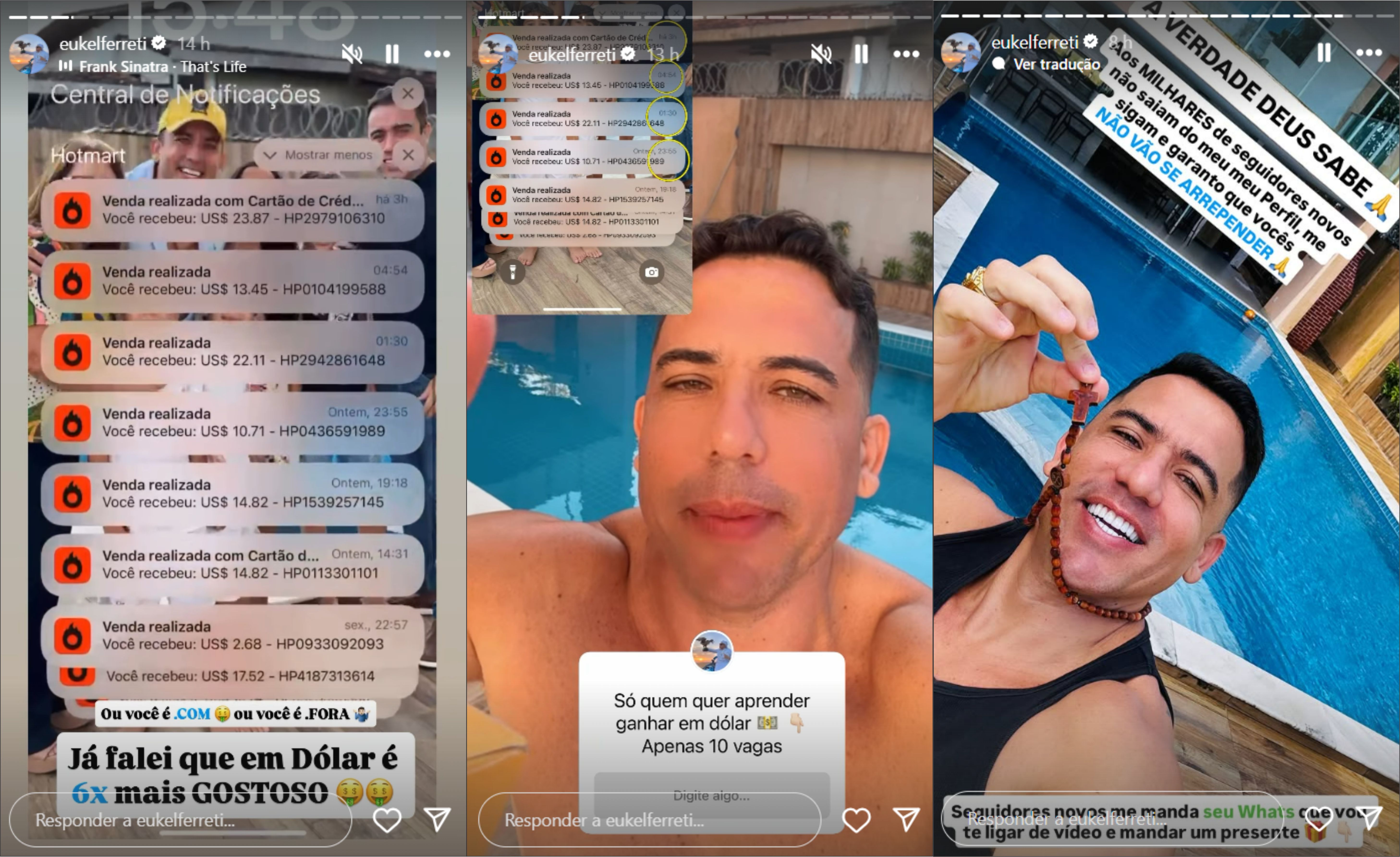Entre os anúncios divulgados, o influenciador promoveu plataformas que prometem “ensinar a ganhar em dólar pela internet” e até “se tornar celebridade sem gastar quase nada”. Em outro vídeo, Ferreti afirmou ter uma “saída financeira para o brasileiro que ganha menos de R$ 3 mil por mês”, mostrando supostos comprovantes de comissões recebidas em moeda estrangeira.