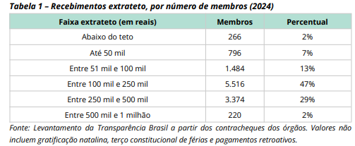 O levantamento mostra que, no total, 11.390 dos 11.656 membros analisados (98%) receberam rendimentos anuais superiores ao teto constitucional. Os valores não incluem gratificação natalina, terço de férias nem pagamentos retroativos, o que significa que os ganhos reais podem ser ainda maiores.