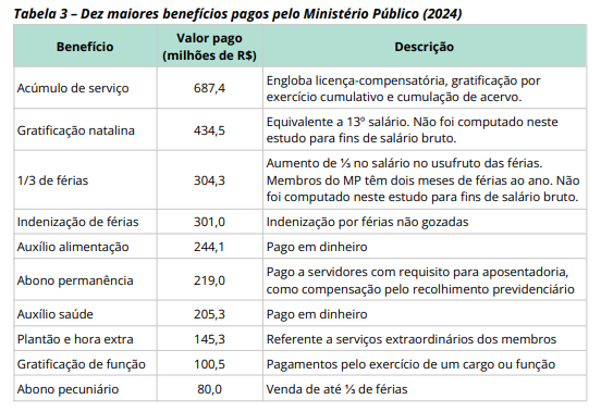 O estudo identificou que o Ministério Público pagou R$ 2,3 bilhões acima do teto constitucional em 2024. Boa parte desse valor decorre de benefícios e indenizações, conhecidos como penduricalhos, que não são contabilizados para efeito do teto.