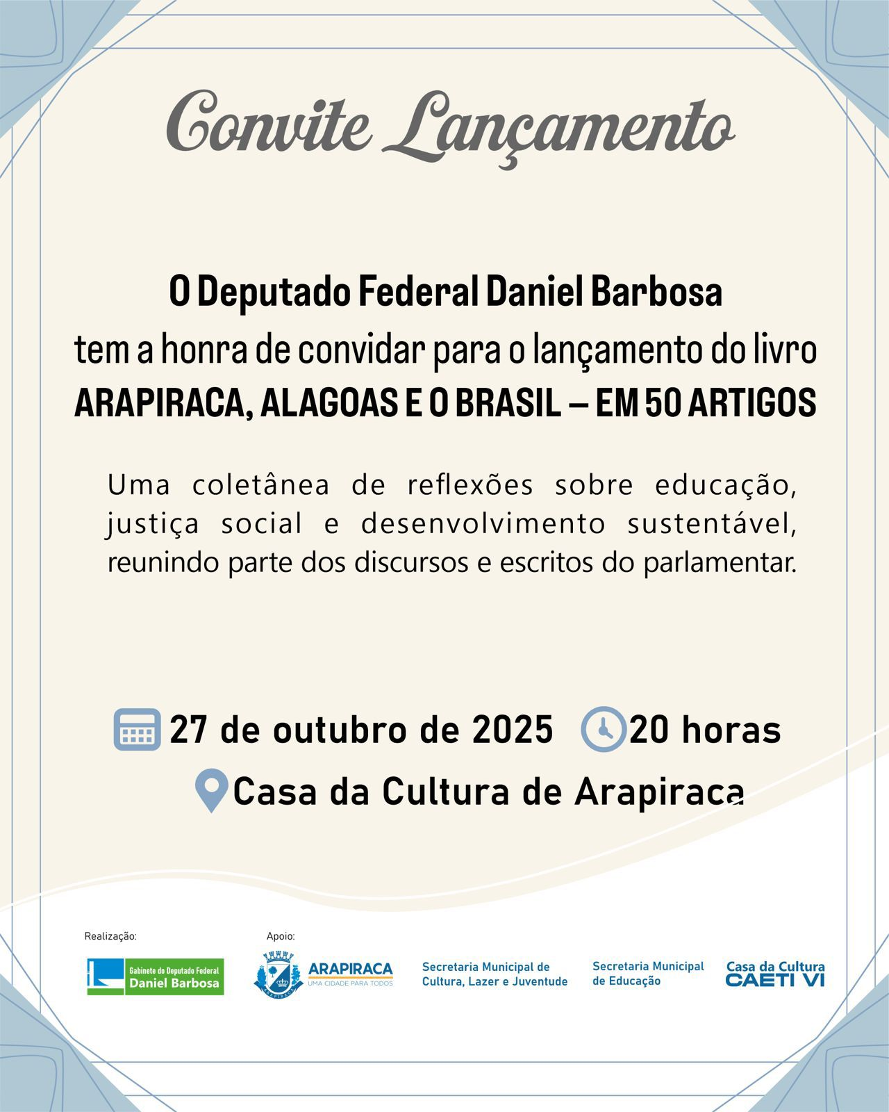 A publicação reúne textos que marcam a trajetória política e intelectual do parlamentar, abordando temas relevantes para o crescimento do município, do estado e do país. O lançamento conta com o apoio da Prefeitura de Arapiraca, por meio das secretarias municipais de Cultura e de Educação.