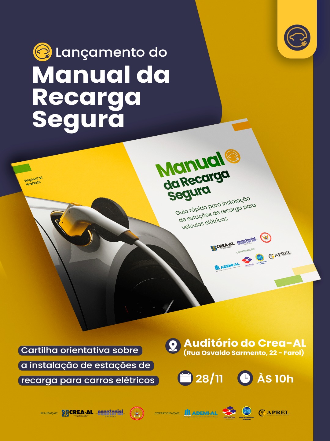 O Conselho Regional de Engenharia e Agronomia de Alagoas (Crea-AL) realizará no dia 28 de novembro, às 10h, o evento de lançamento do “Manual da Recarga Segura”. O guia, desenvolvido em parceria com o Corpo de Bombeiros Militar de Alagoas (CBMAL) e a Equatorial Energia Alagoas, será a principal referência técnica do estado para a instalação segura e em conformidade de estações de recarga de veículos elétricos e híbridos em condomínios e residências.