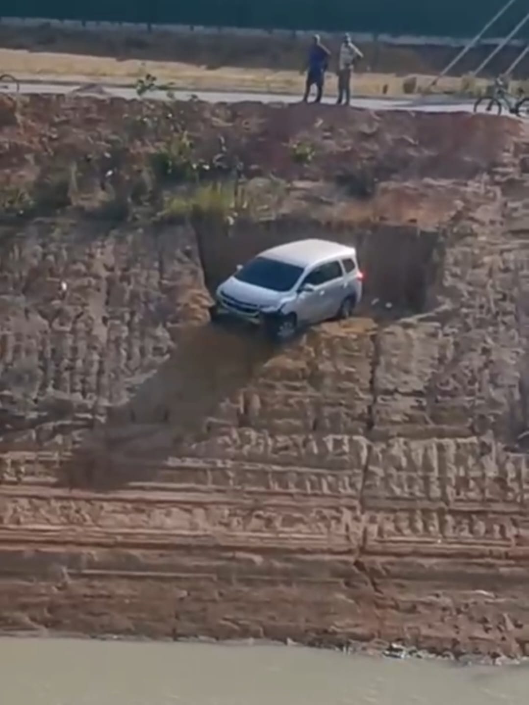 A imagem impressiona porque o veículo caiu justamente numa parte da ribanceira que tinha um buraco e impediu a sua queda e o mergulho no córrego existente ao longo da via.