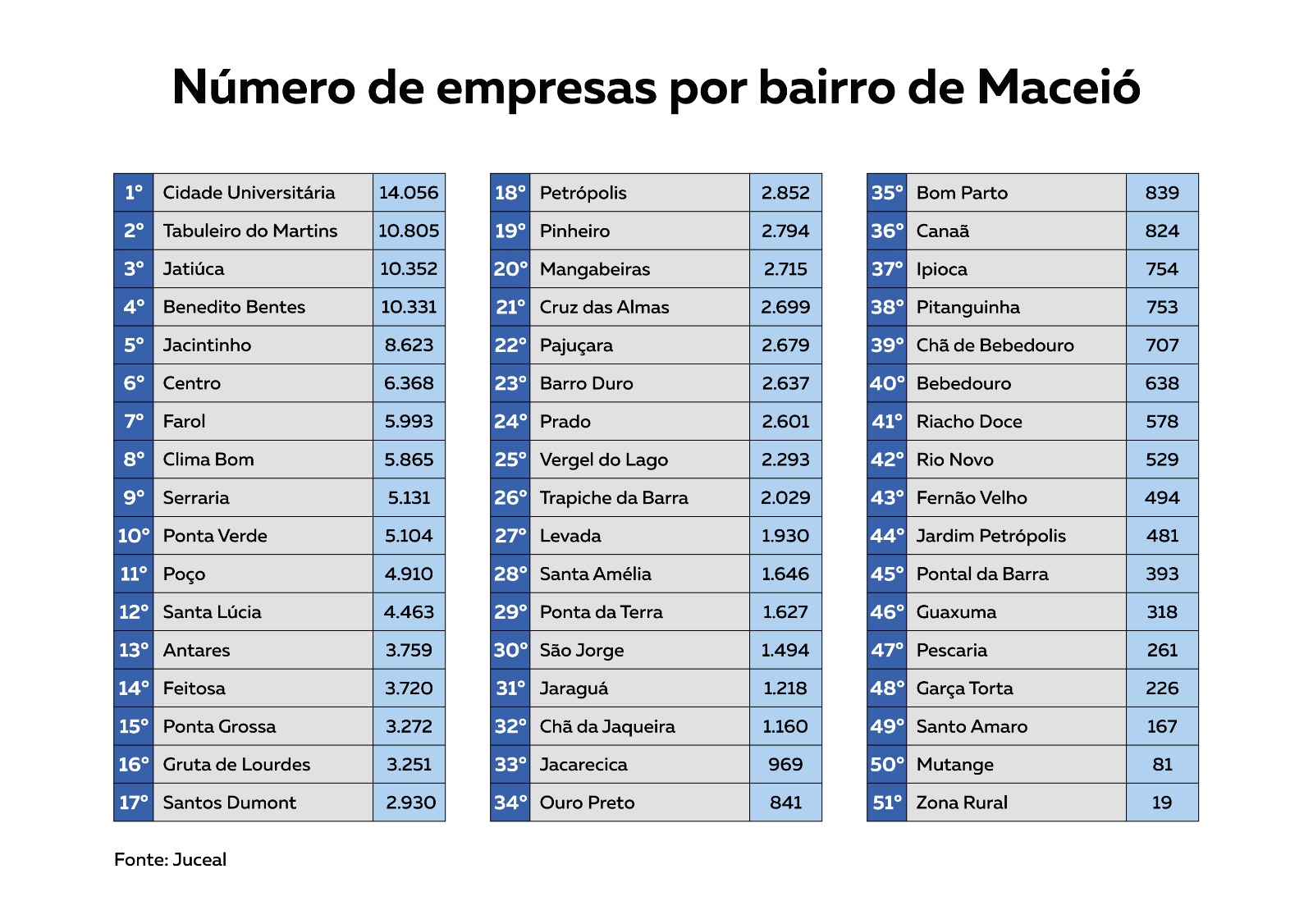 Enquanto os bairros com menos empreendimentos são Zona Rural (19 empresas), Mutange (81), Santo Amaro (167), Garça Torta (226), Pescaria (261), Guaxuma (318), Pontal da Barra (393), Jardim Petrópolis (481), Fernão Velho (494) e Rio Novo (529).O estudo promovido pela Junta Comercial ainda traz outros detalhamentos sobre as empresas situadas em Maceió.