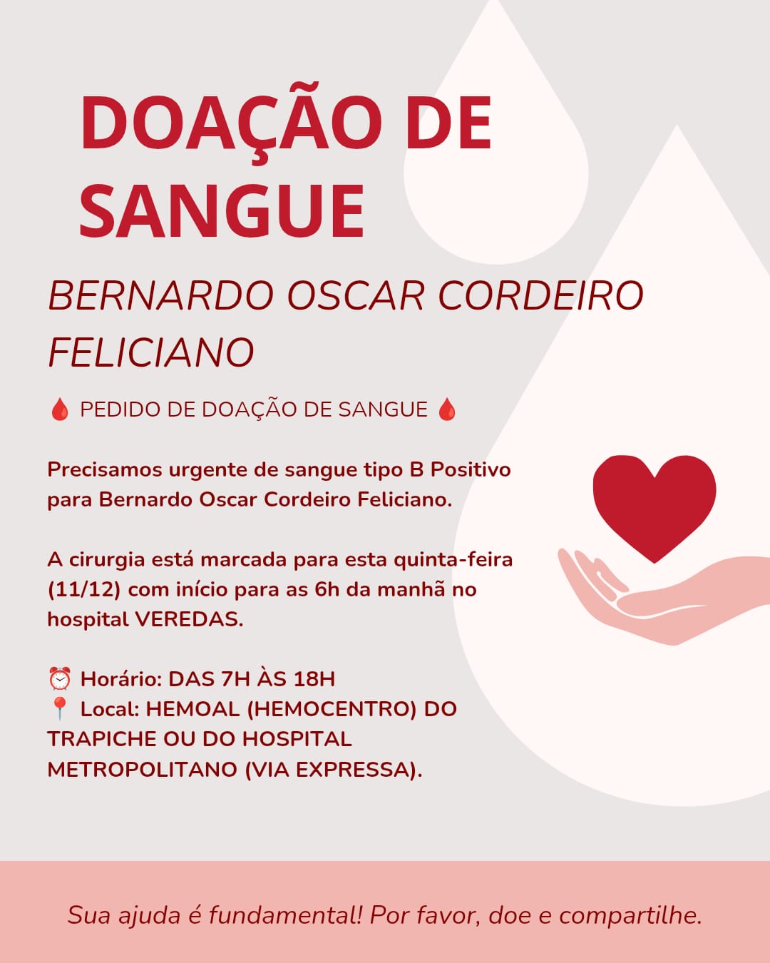 A família pede ainda que, quem não puder doar, ajude compartilhando o pedido para alcançar mais voluntários.