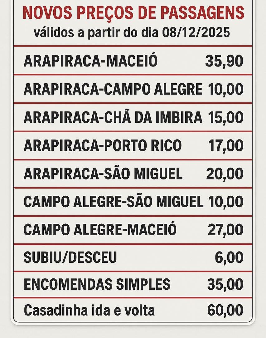 O cidadão de Maceió que precisa se deslocar para o interior, especialmente para Arapiraca, a segunda maior cidade do estado, vai pagar R$ 35,90. Antes, a passagem custava R$ 32. O deslocamento de Maceió a Delmiro Gouveia custará R$ 74,90.