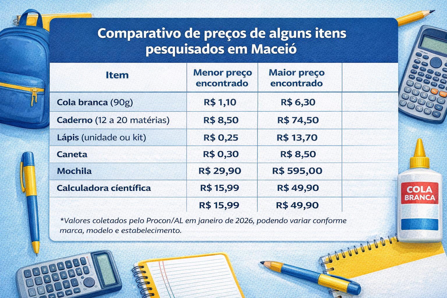 A pesquisa analisou itens de uso comum, como cadernos, lápis, canetas, borrachas, mochilas, estojos, colas, tintas e calculadoras científicas. De acordo com o Procon/AL, a variação de preços entre os estabelecimentos é significativa, o que reforça a importância da pesquisa prévia antes da compra.