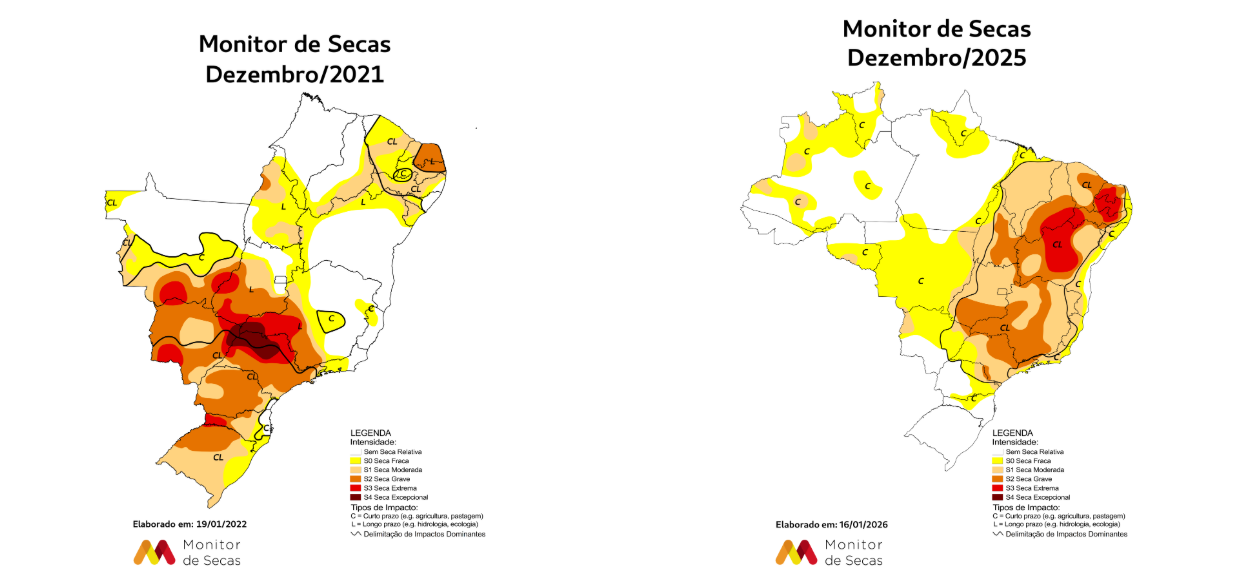 A situação registrada no fim de 2025 contrasta com o cenário observado cinco anos antes. Em 2021, a seca, apesar de severa em alguns períodos, esteve mais concentrada nas regiões do Sertão e do Sertão do São Francisco.