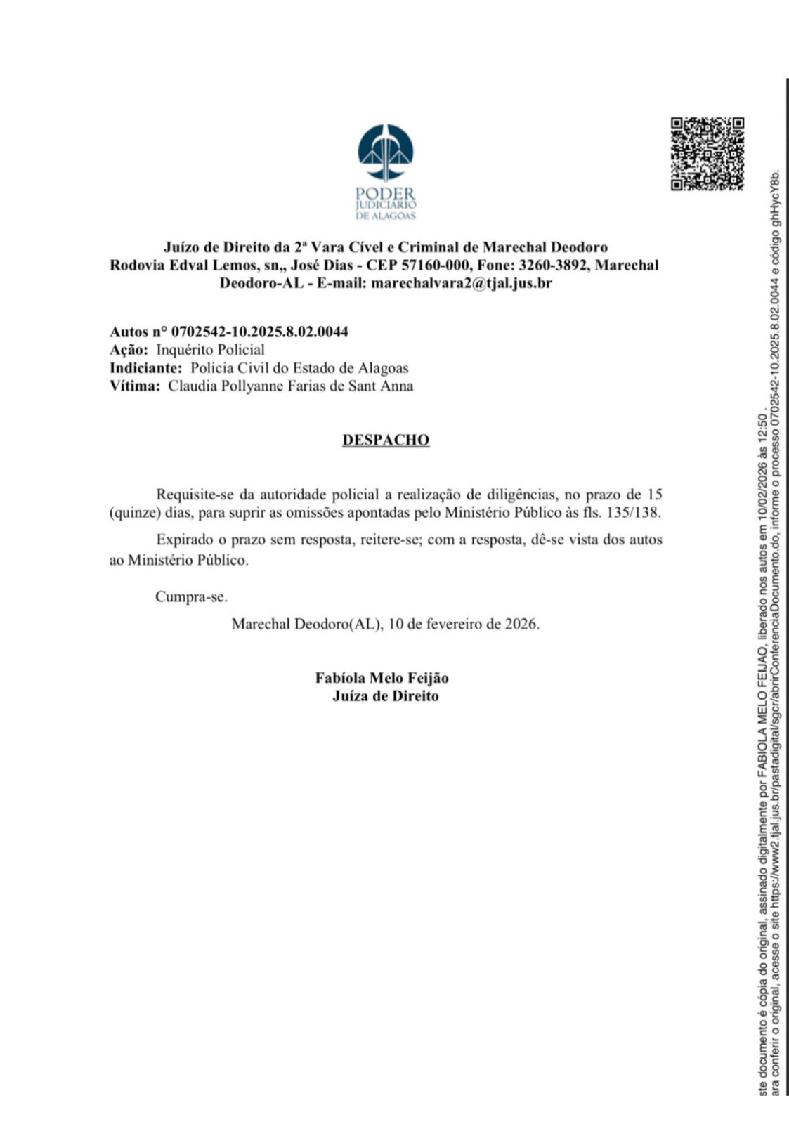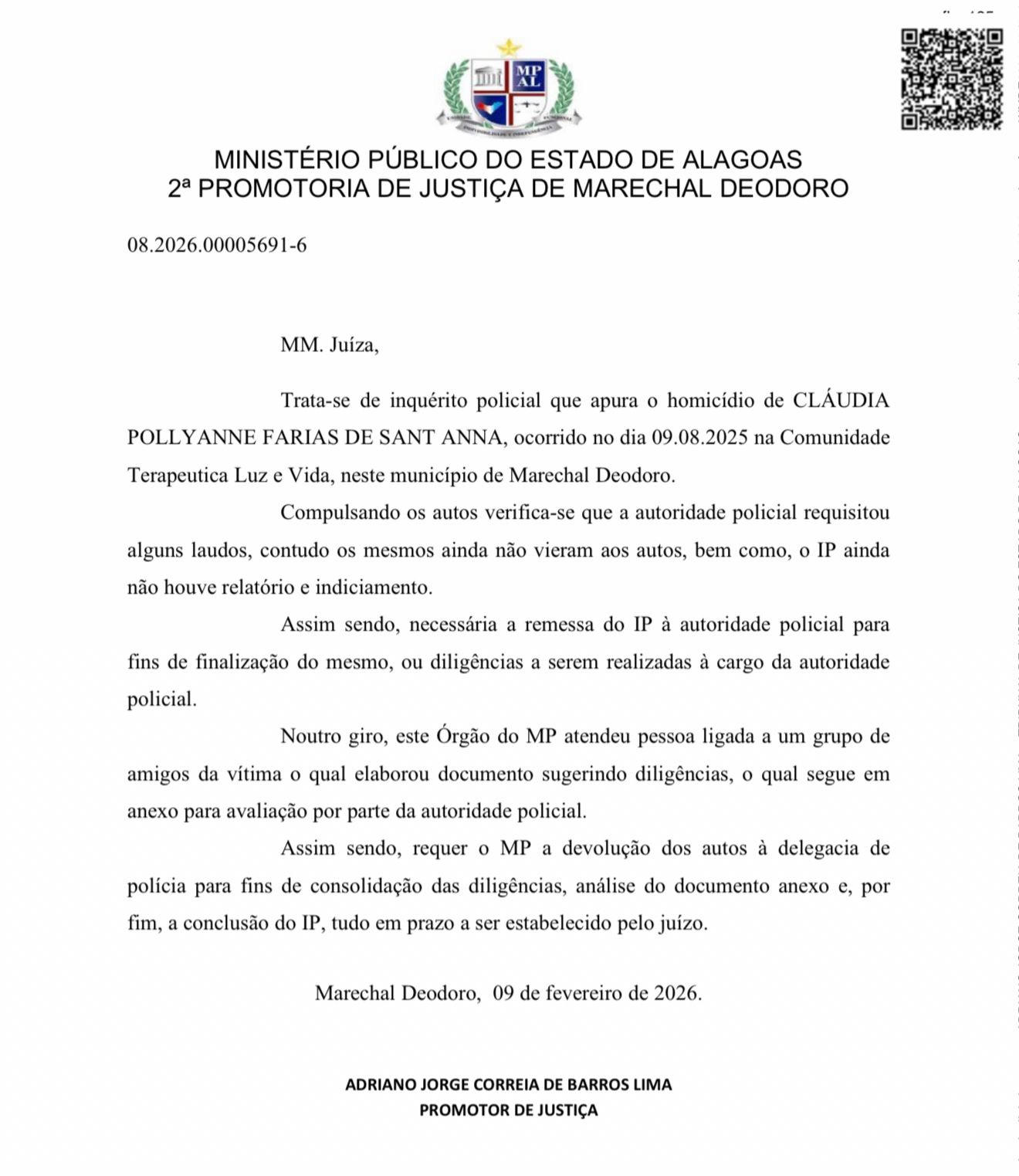 A Justiça determinou a devolução do inquérito policial que apura a morte de Cláudia Pollyane Farias de Sant’Anna à delegacia responsável, após manifestação do Ministério Público do Estado de Alagoas, que apontou a inexistência de conclusão do procedimento, ausência de relatório final, falta de indiciamento e laudos técnicos ainda pendentes.