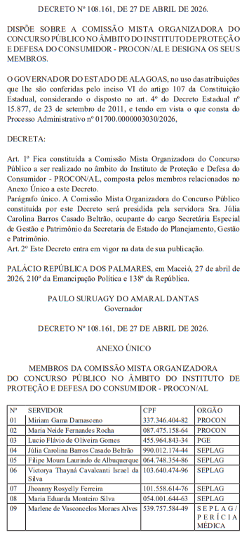 O governo de Alagoas instituiu a comissão mista responsável pela organização do concurso público do Instituto de Proteção e Defesa do Consumidor de Alagoas (Procon-AL). O decreto foi publicado no Diário Oficial do Estado (DOE) desta terça-feira, 28, e marca o início dos trâmites para realização do certame.