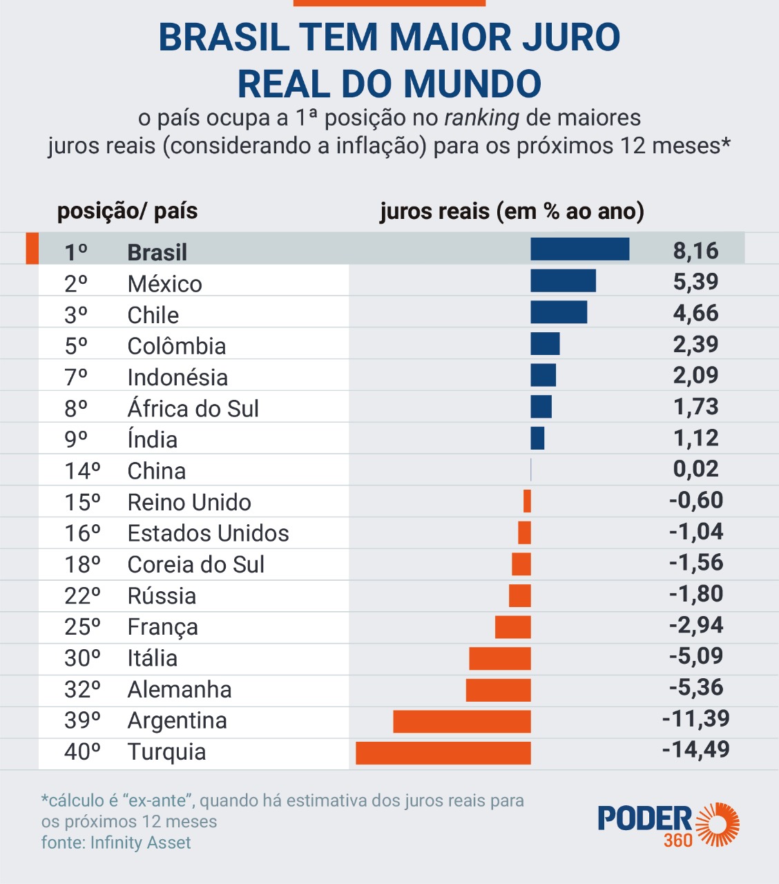Os juros reais são aqueles corrigidos pela inflação. A Infinity traçou a projeção para os próximos 12 meses, o que é o cálculo “ex-ante”. Em dezembro de 2021, os juros reais brasileiros estimados eram de 5,03%, abaixo da Turquia (5,83%).