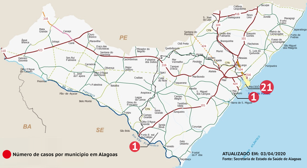 De acordo com a pasta, dos casos confirmados em Alagoas, 19 residem no Estado, sendo 17 em Maceió e dois no interior, nos municípios Porto Real do Colégio e Marechal Deodoro. As outras quatro pessoas que testaram positivo para Coronavírus residem no Rio de Janeiro (2) e em Brasília (2).