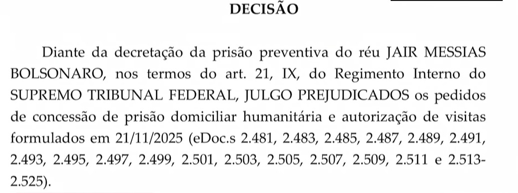 Os pedidos incluíam solicitação para que Bolsonaro permanecesse em prisão domiciliar por motivos humanitários, além de pleitos para flexibilizar e ampliar o rol de visitantes autorizados a ter contato com o ex-presidente. Com a decisão, nenhuma dessas solicitações será apreciada neste momento.