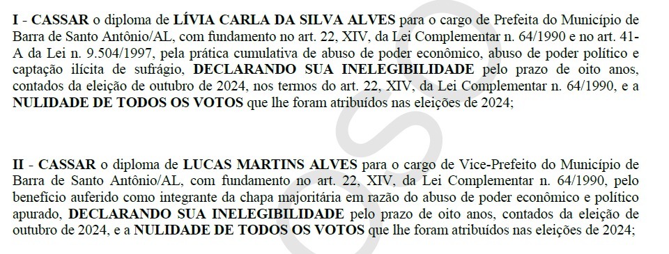 O juiz eleitoral da 17ª Zona cassou os diplomas da prefeita de Barra de Santo Antônio, Lívia Carla da Silva Alves, e do vice-prefeito Lucas Martins Alves, eleitos nas eleições de 2024, por abuso de poder político e econômico e captação ilícita de sufrágio [compra de votos]. A decisão de 1º grau também declarou a inelegibilidade dos dois pelo prazo de oito anos e anulou os votos obtidos pela chapa.