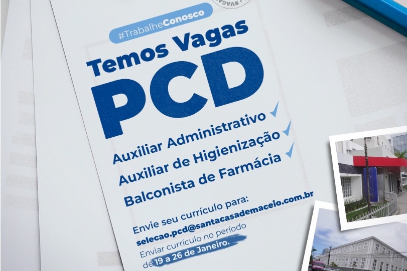 Valorizando a diversidade e acreditando no potencial de cada indivíduo, a Santa Casa de Maceió abriu vagas PcD para auxiliar administrativo, auxiliar de higienização e balconista de farmácia. As oportunidades são para contratação imediata e banco de reserva.