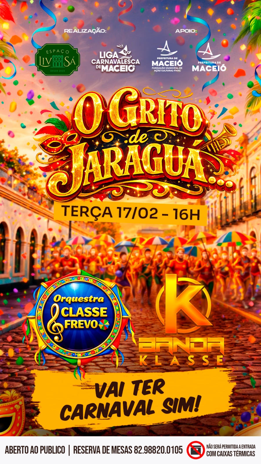 A festa encerrará o carnaval de Maceió na terça-feira de carnaval, com abertura às 16 horas e início das apresentações às 17 horas, na esquina da Rua Sá e Albuquerque, no já chamado “Beco da Folia”, em frente à Receita Federal, até o estacionamento de Jaraguá.